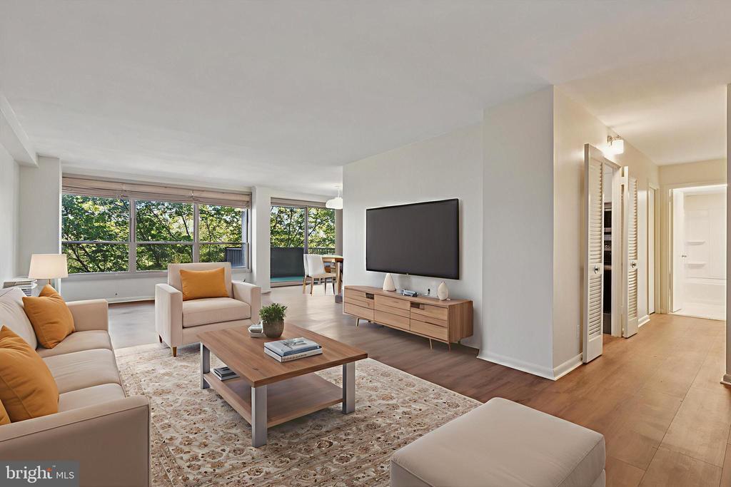 Enjoy the feeling of residential living with a resort feel in the heart of the main line and centrally located. Situated on 23 wooded and landscaped acres with lots of trees, it feels like a private oasis! You'll be impressed with a long list of ammenities as well. Inside unit 801 you'll be greeted by newly installed luxury plank flooring throughout the unit, wall to wall windows with views of trees and the outdoor pool in a spacious, open, light-filled space. Fresh paint in light neutral shade throughout, just bring your furniture and decor and settle in! This unit has been meticulously renovated to be clean, fresh and modern. The galley-style kitchen has been outfitted with new, crisp white cabinets, beautiful countertops and a stunning subway style backsplash. A new stove has also been added and the refrigerator is included. The bedroom is spacious with one large window wall and great views. A new bathroom awaits as well in bright white and ready for your personal touches. Washer and dryer are included with the unit as well as new roman shades in the living area and vertical blinds in the bedroom. Outside enjoy your balcony sights and sounds and the fresh breeze. The list of ammenities is a long one. 24 hours security, outdoor swim club ( fee required), fitness center with indoor pool ( fee required),tennis courts, game room, playground,library, banquet rooms available for rental fee,free shuttle, storage lockers and more. This unit comes with an 8'x8' private storage space located in the basement, ample free parking. All this awaits in a centrally located space close to main roads, highways, hospitals, schools, shopping, restaurants and more. The monthly condo fee covers all utilities except cable.