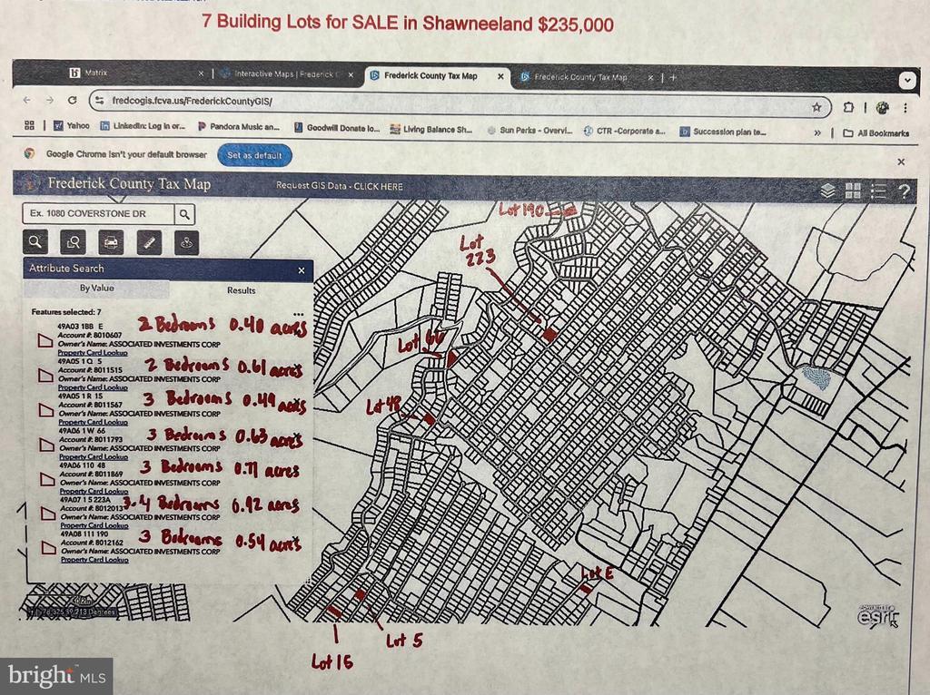 CALLING ALL BUILDERS!! SEVEN BUILDING LOTS for $235,000 (being sold as a bundle) located in Shawneeland in Frederick County, VA. . Perc approved certification letter, plat and sewer docs on file for each lot. The lots range in size from 0.40-0.92 acres. Potential home sites for permanent home or weekends and vacations. Enjoy hiking, fishing, swimming in the lake, nature walks and playgrounds for the kids. Maintenance of roads, common areas, amenities, snow plowing etc managed by Shawnee Land Sanitary District/Frederick County. Sanitary District Tax just $190 for unimproved lot. Shawneeland (also known as Shawnee Land) is a residential community located on the eastern slopes of Great North Mountain. Lots included by tax ID #: 49A3-1-BB-E has 2 Bedroom perc on 0.40 acres; 495A5-1-Q05 has 2 Bedroom perc on 0.61 acres; 49A5-1-R-15 has 3 Bedroom perc on 0.49 acres; 49A06-1-W-66 has 3 bedrooms on 0.63 acres; 49A06-110-48 has 3 Bedroom perc on 0.71 acres; 49A07-1-5-223A has 3 Bedroom perc on 0.92 acres; 49A08-111-190 has 3 Bedroom perc on 0.54 acres. DETAILS for EACH LOT ARE IN DOCUMENTS. Contact listing agent with questions.
